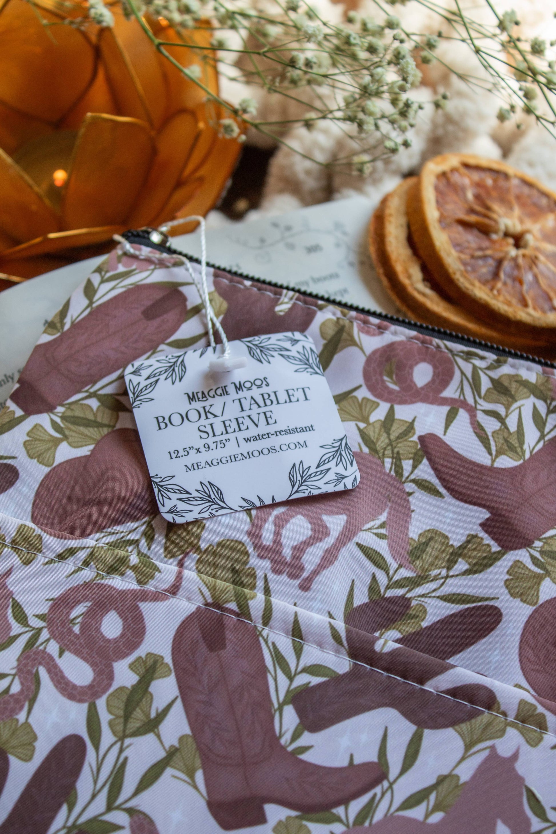 This large water-resistant book / tablet sleeve was designed by a reader for readers. This book sleeve is large enough to hold even the chonkiest of fantasy novels and will keep them safe along your travels.
