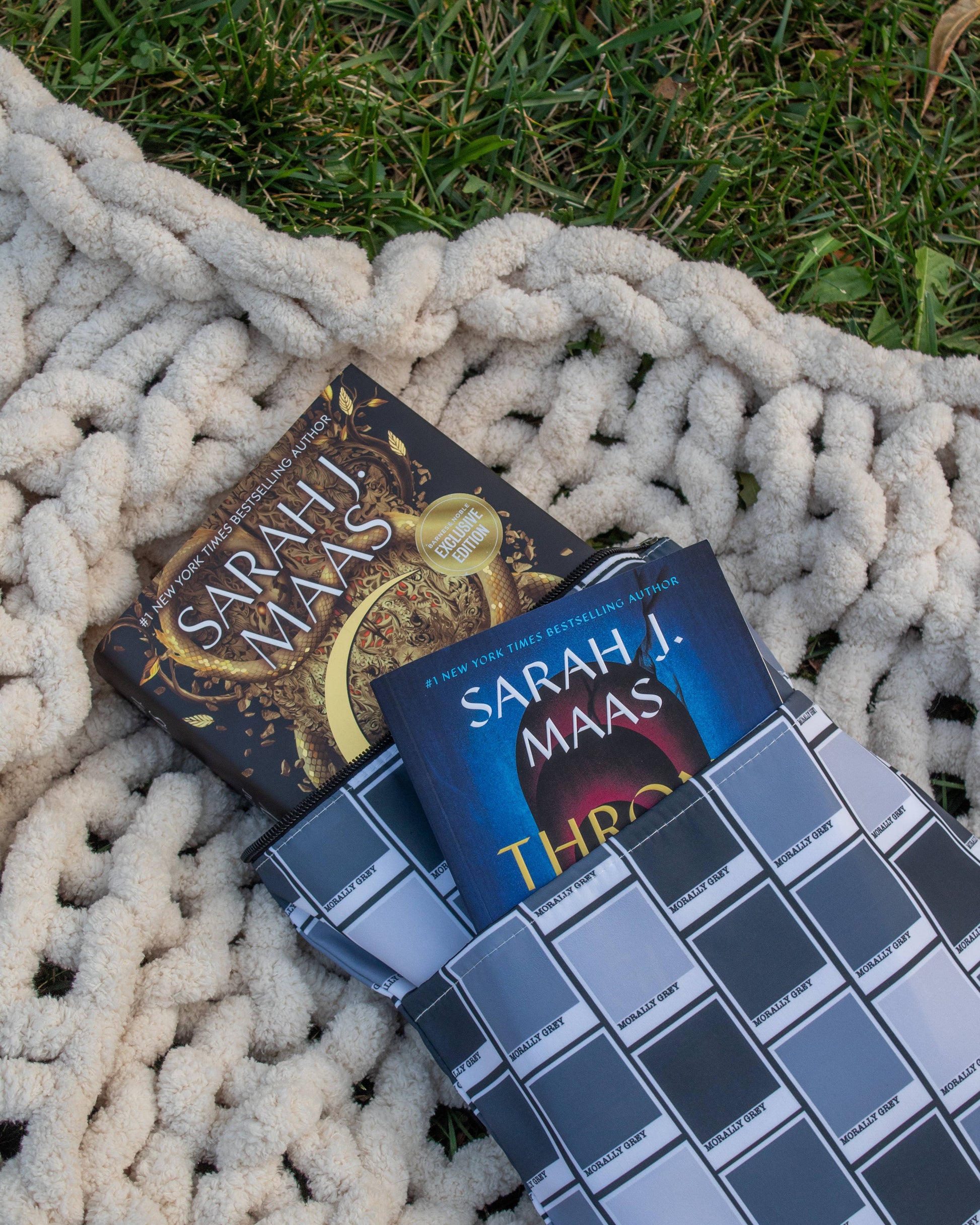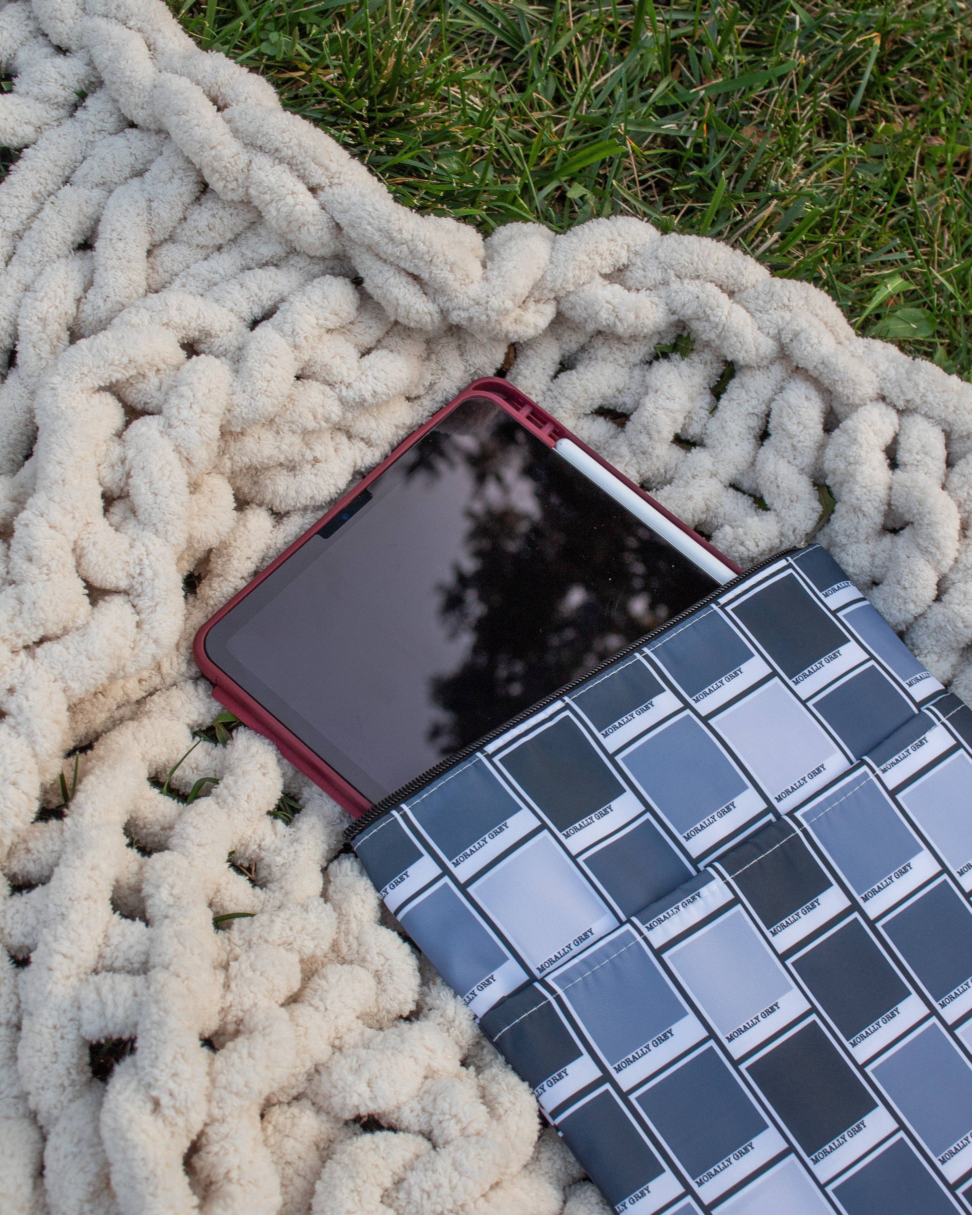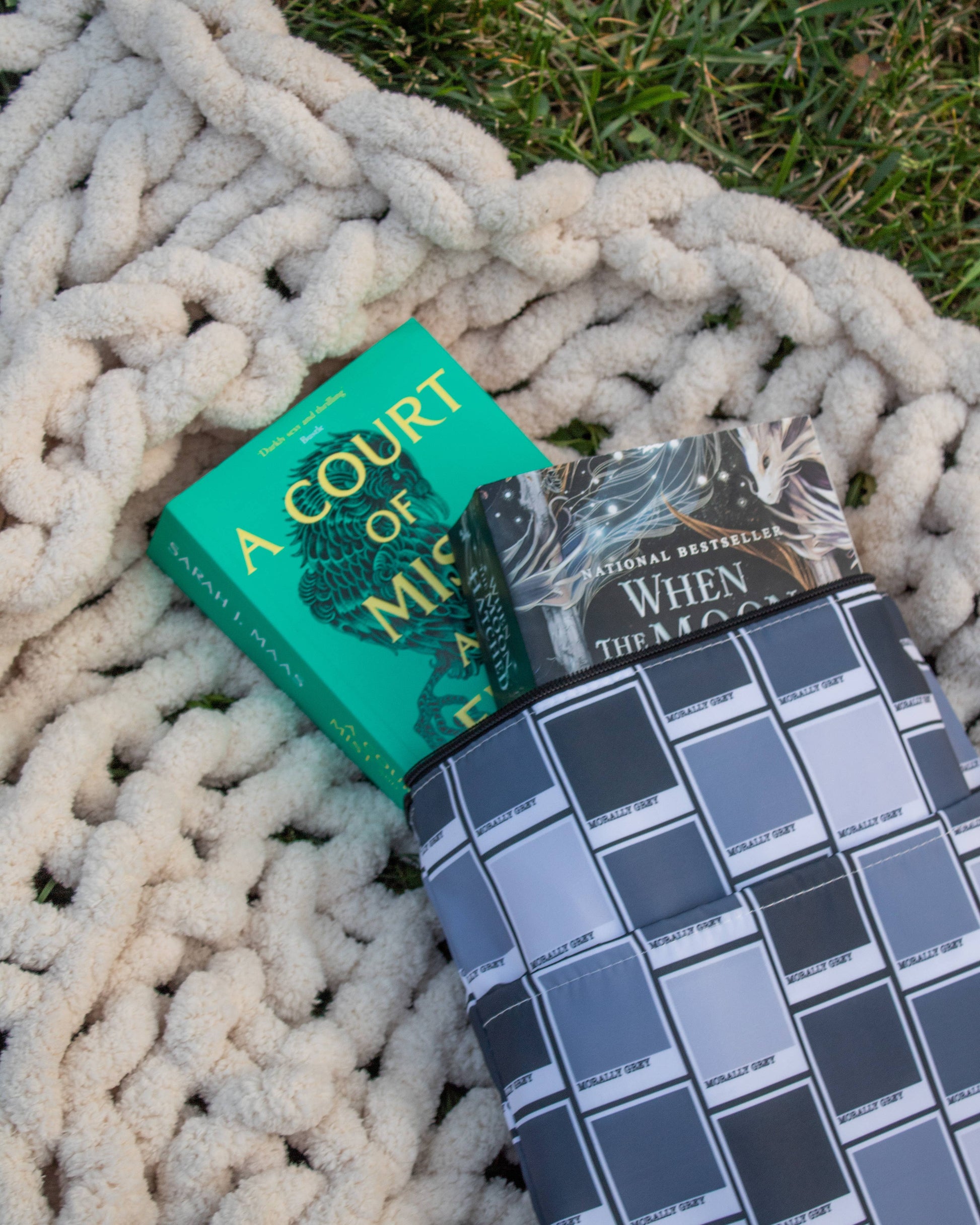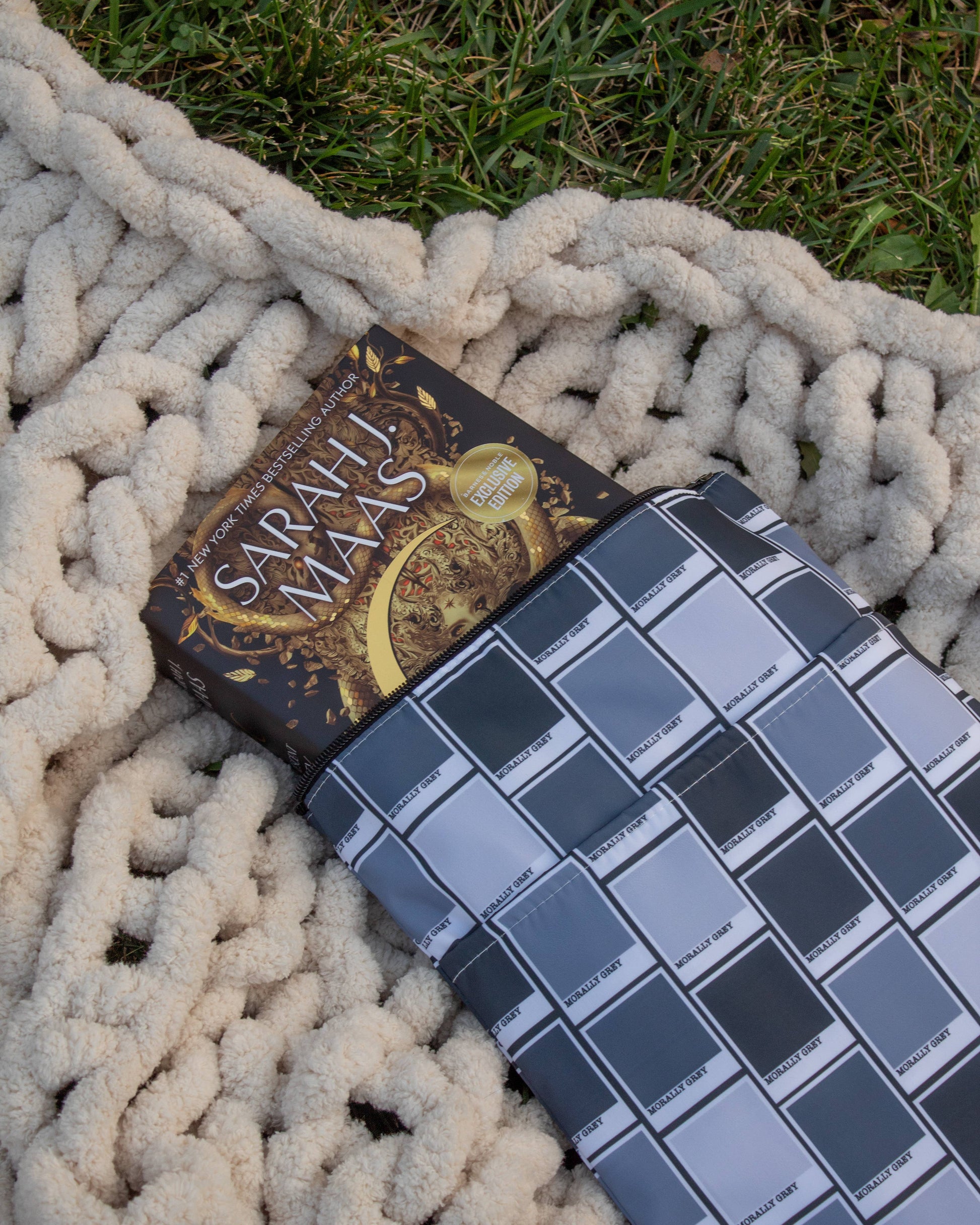 This large water-resistant book / tablet sleeve was designed by a reader for readers. This book sleeve is large enough to hold even the chonkiest of fantasy novels and will keep them safe along your travels.