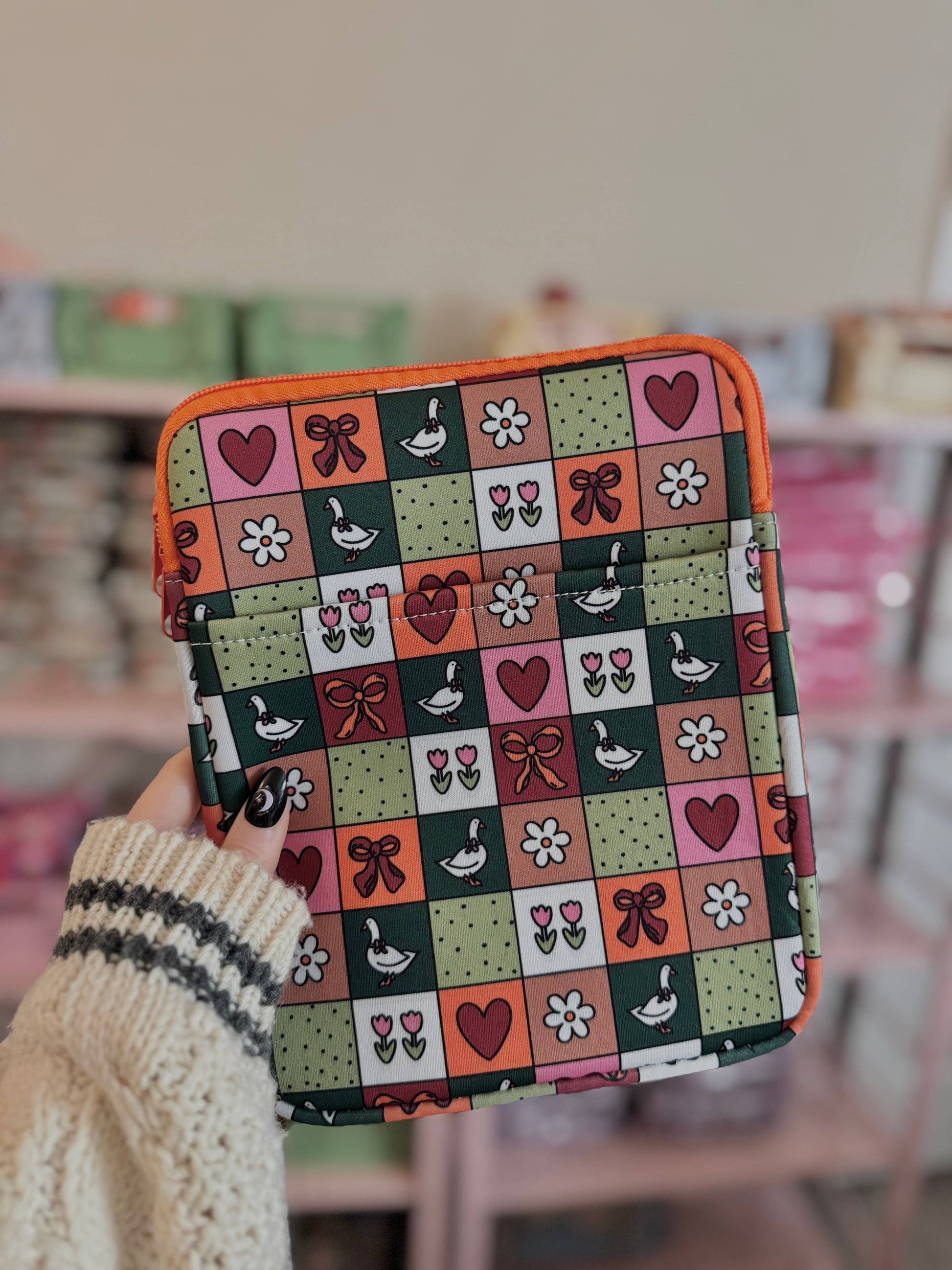 Zipper Kindle / E-Reader or Standard Paperback Book Pouch This cute little padded sleeve features a cozy cottagecore goose quilted pattern Has a front pocket / pouch to fit any extra reading accessories such as your kindle or E reader, notebook, pens, ect! It also has a zipper to help keep the book safe inside. Details: ✨Neoprene Material ✨Double Zipper ✨Size : 6.7in x 8.7in Care Instructions: ✨Machine Washable ✨Must Air Dry - Do not throw in the dryer These make great gift items for bookworms, perfect for retail and book stores.