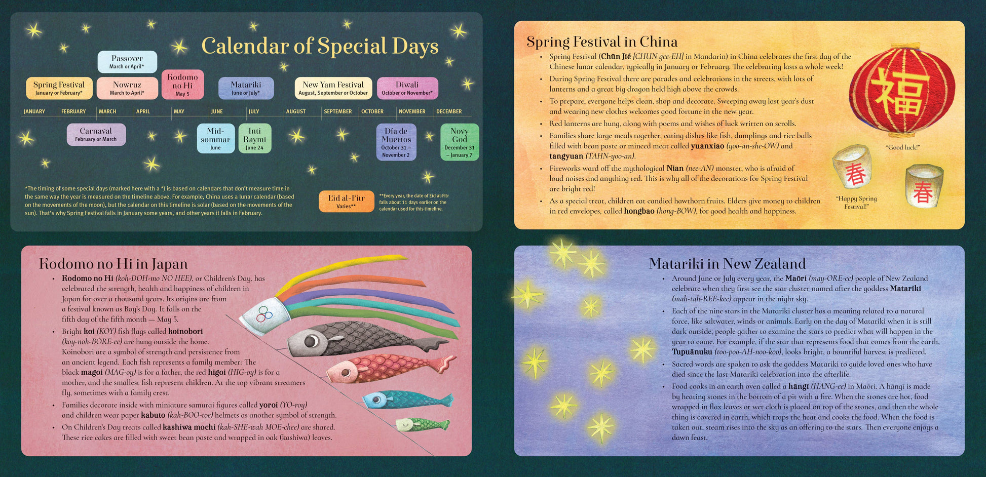 "An accessible tool for teaching children about world cultures, seasonal special events, and festivals for school and public library collections" ― School Library Journal Experience the wonder of 13 holidays from around the world! From the Spring Festival in China to Inti Raymi in Peru and the New Yam Festival in Nigeria, experience an immersive journey bright with lyrical text and vibrant illustrations. Perfect for sparking curiosity, this book helps young readers appreciate diverse traditions and the joy of coming together. *Features holidays from: Japan, China, New Zealand, Peru, Brazil, Sweden, Iran, United States, Nigeria, Russia, Egypt, Mexico, India *Includes pronunciaton guides and a global festival calendar *Educational endnotes explain the significance of celebrations portrayed in the book.